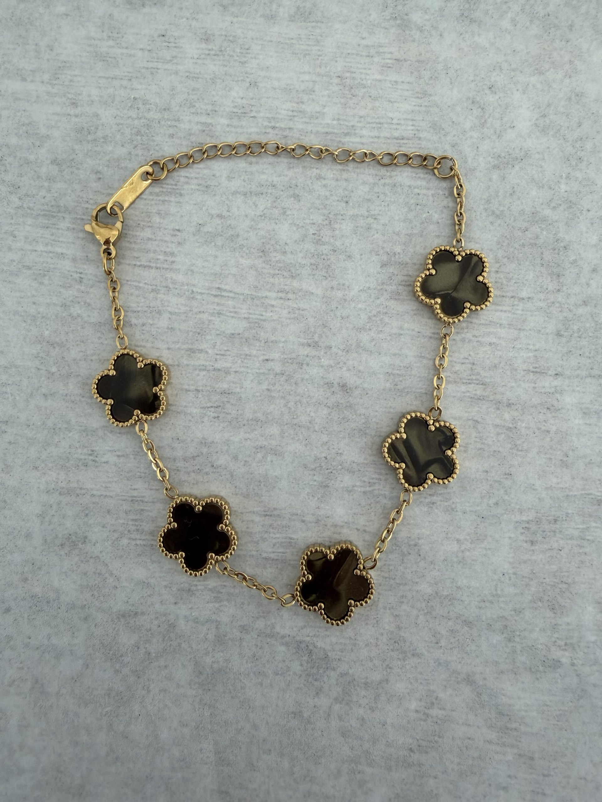 Ce bracelet en acier inoxydable doré est orné de cinq charms en forme de trèfle, chacun incrusté de nacre. Les charms sont reliés par une chaîne délicate, ajoutant une touche de sophistication et de charme. Le fermoir mousqueton doré assure une fixation sécurisée et durable, parfait pour agrémenter vos tenues avec une note de raffinement et d’élégance intemporelle.